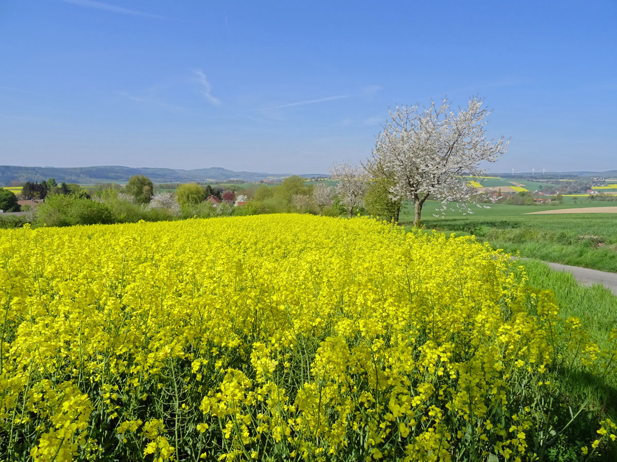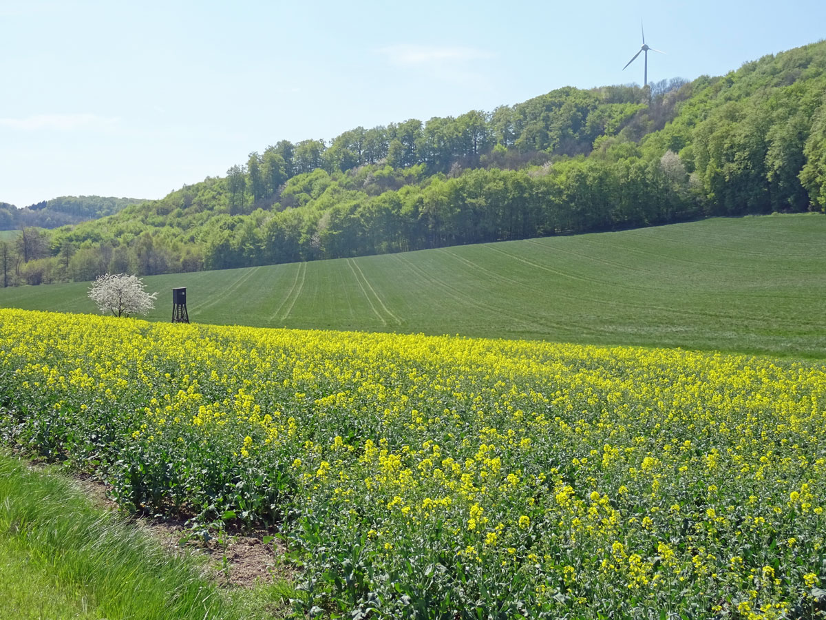 nur Vogelgezwitscher, es riecht nach Frühling. Unten nach der Linkskurve ist der Ortseingang von Dehrenberg.